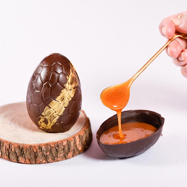 This set of two Easter eggs, made from our semi sweet couverture, filled with sinful, rich milk chocolate and buttery caramel, will be welcome this Easter.