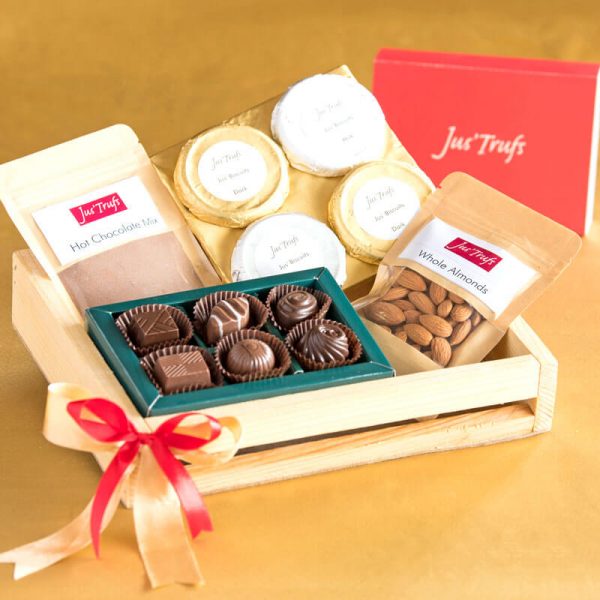 The perfect gift with something for everyone. This cute tray is packed with an assortment of six classic truffles, Orange Duet, Heavenly Milk, Fruit n Nut, Bittersweet Coffee, Mandarin Surprise, and Strawberry Melody, and 4 artisanal chocolate coated biscuits, milk and dark and 1 pack of hot chocolate mix and a pack of premium almonds, 50 gm each.