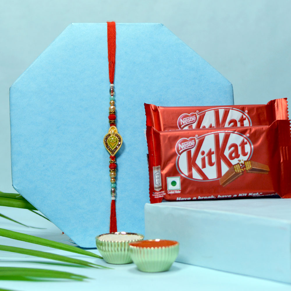 Golden Green Designer Beads Rakhi with Kitkat Chocolate